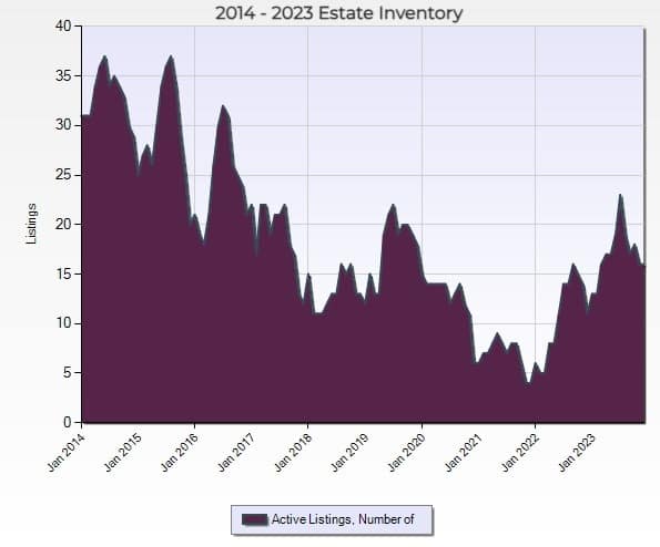 • Inventory continues to tighten, with only nine properties active at year-end, compared to 14 at the end of Q2 and 12 at the end of Q3. However, this is still higher than the end of 2022, when there were only 5 active listings. And while inventory is higher than it was during the pandemic boom from late 2020 to early 2022, it is still very low by historical standards.